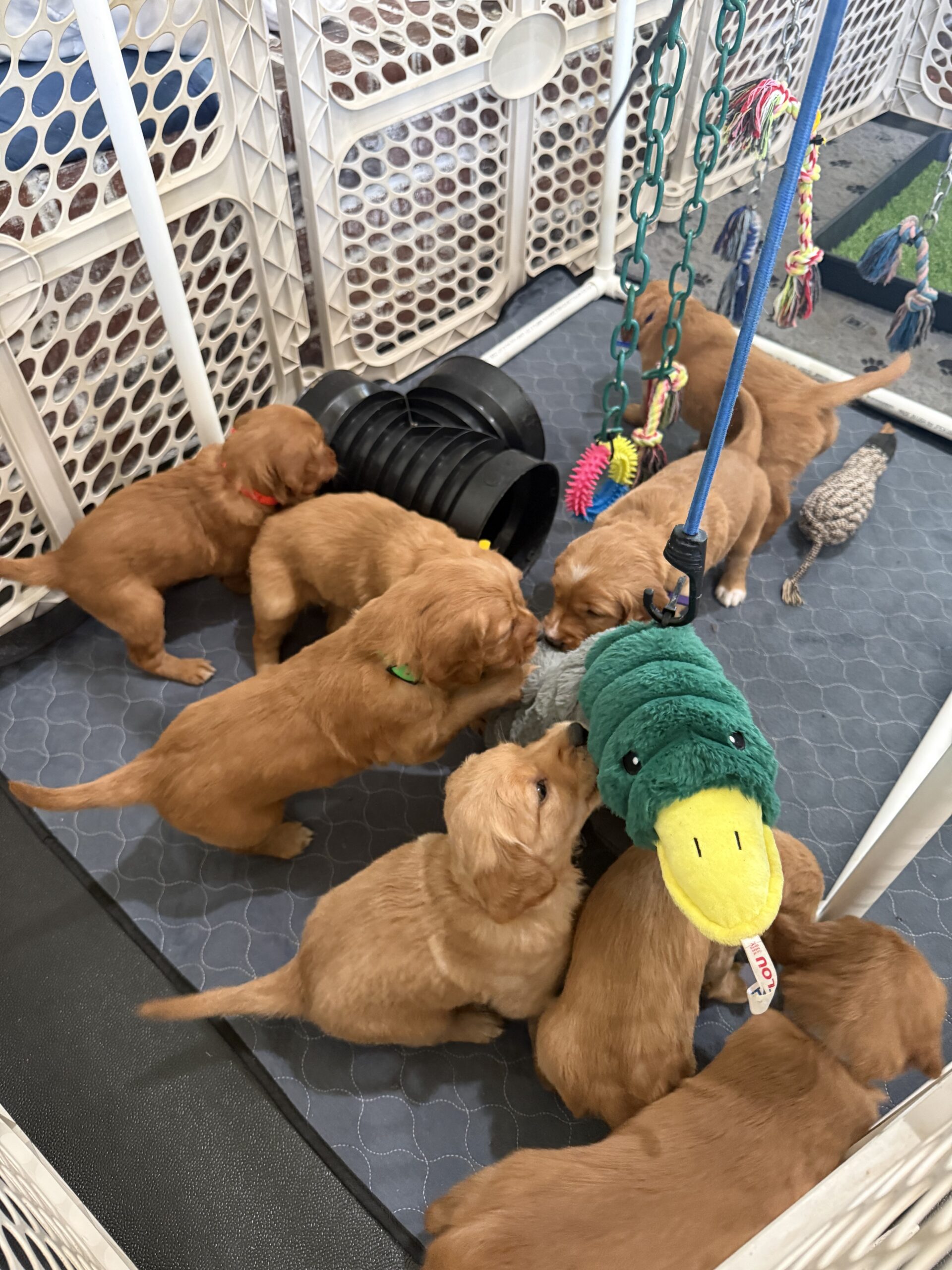 One of the biggest changes is that they are now in the same room as the Ghillie pups. And if you know anything about that crew… they are wild 😂 The Bonnie pups are very interested in all the noise and chaos and spend plenty of time watching (and learning!) from them.